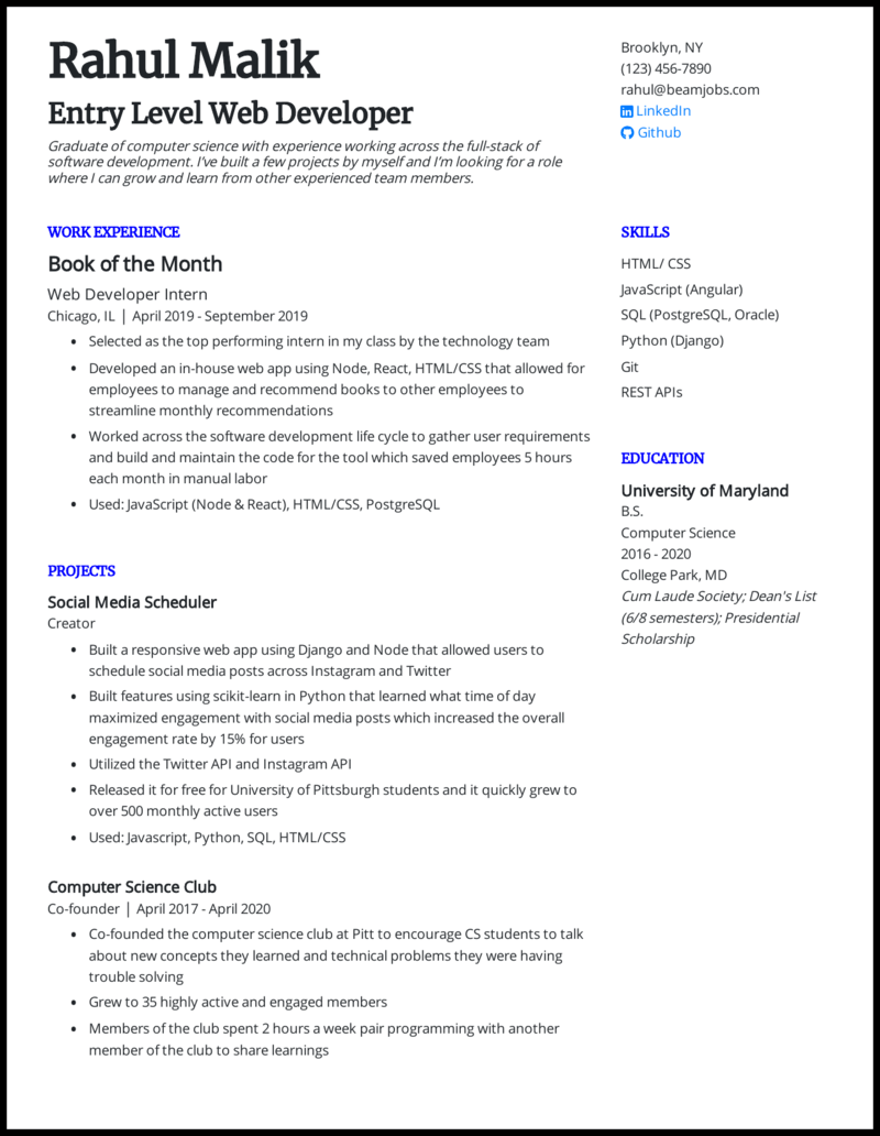 For a professional web developer resume, we recommend: Here is a front end developer resume sample to give you the exact idea of what this blog can help you curate a tailored resume of front end developer. You may also want to include a headline or summary statement that clearly communicates your goals and qualifications. Use america's top resume builder & interview tips. Tested, programmed, and debugged 10+ web applications with 100% accuracy